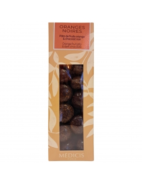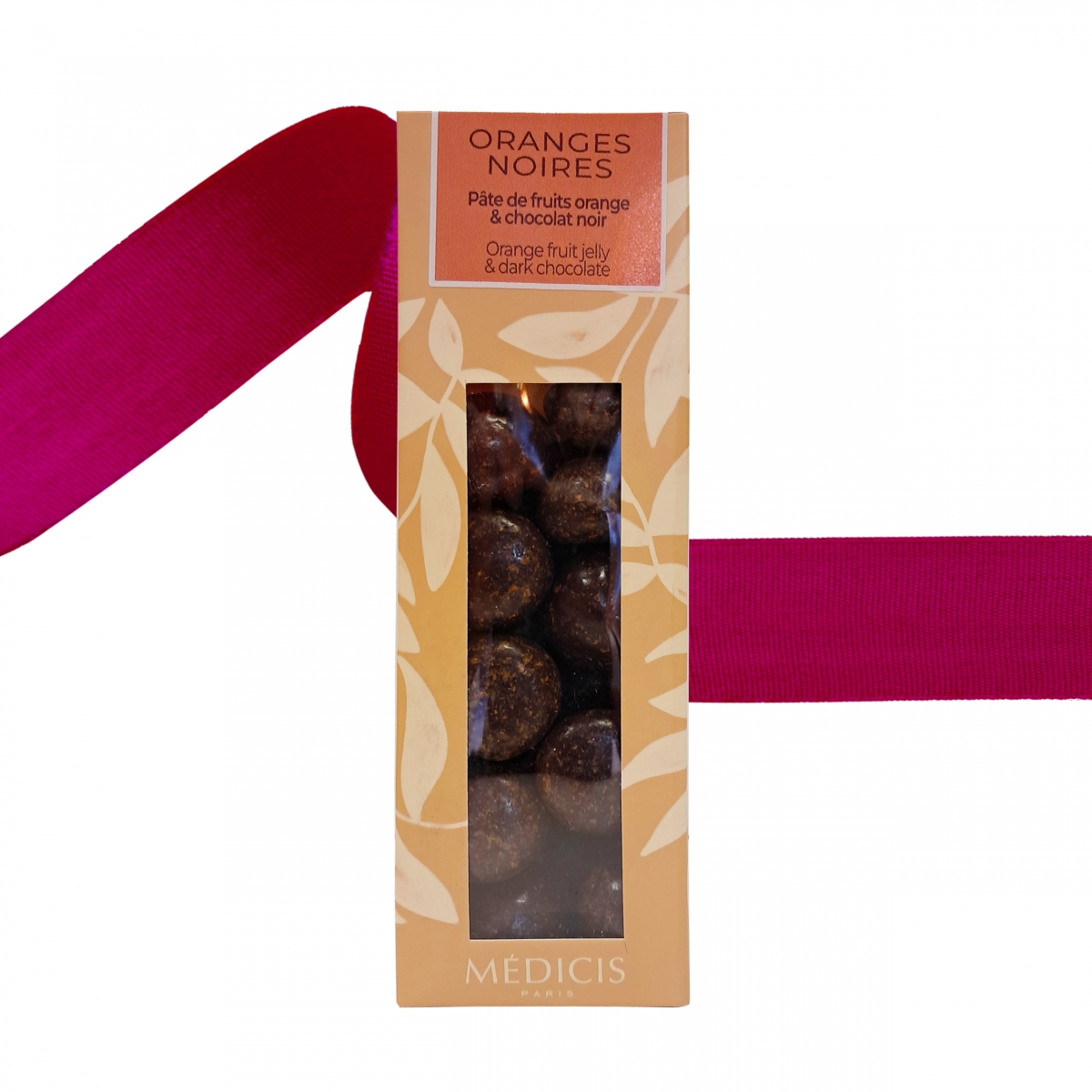 Un mariage subtil entre la fraîcheur acidulée de l’orange et l’intensité du chocolat noir. Les Oranges Noires Médicis associent une tendre pâte de fruit d’orange enrobée d’un délicat chocolat noir pur beurre de cacao. Chaque bouchée offre une expérience équilibrée entre la douceur fruitée, l’amertume du cacao et une touche d’amertume raffinée.