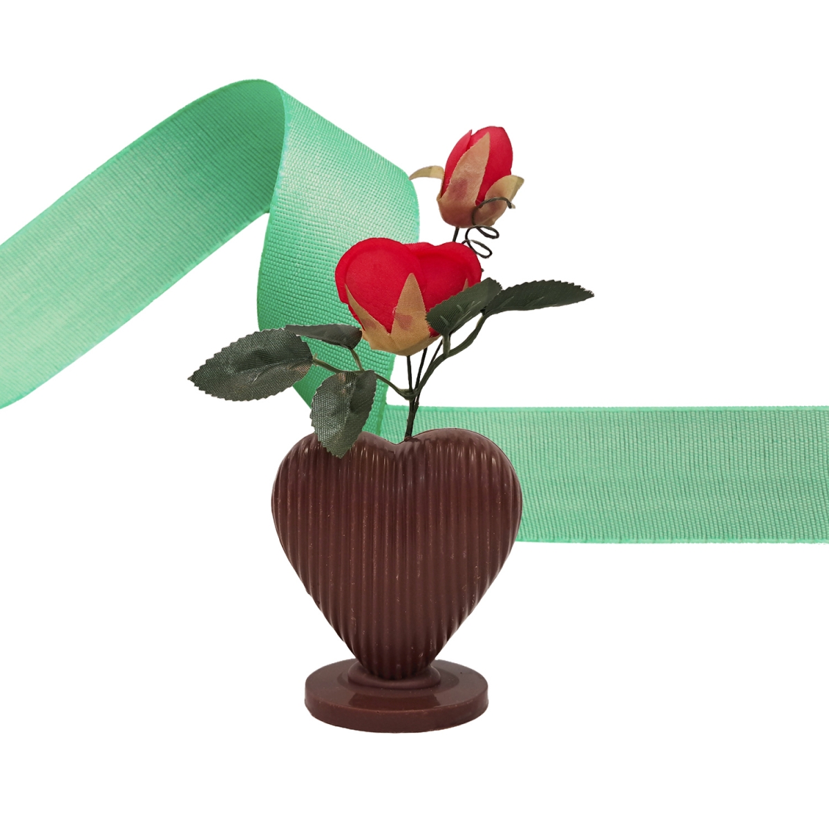 Dans un vase en forme de cœur entièrement en chocolat et fourré d’un praliné fondant, deux délicates roses rouges viennent sublimer cette création poétique. Une attention sucrée qui fera chavirer le cœur de toutes les mamans.