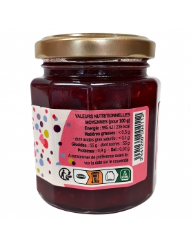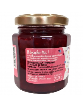 Framboises 66%, sucre de canne, arôme naturel de rose, gélifiant : pectine de fruits, jus concentré de citron, pétales de roses 0,1%.