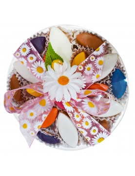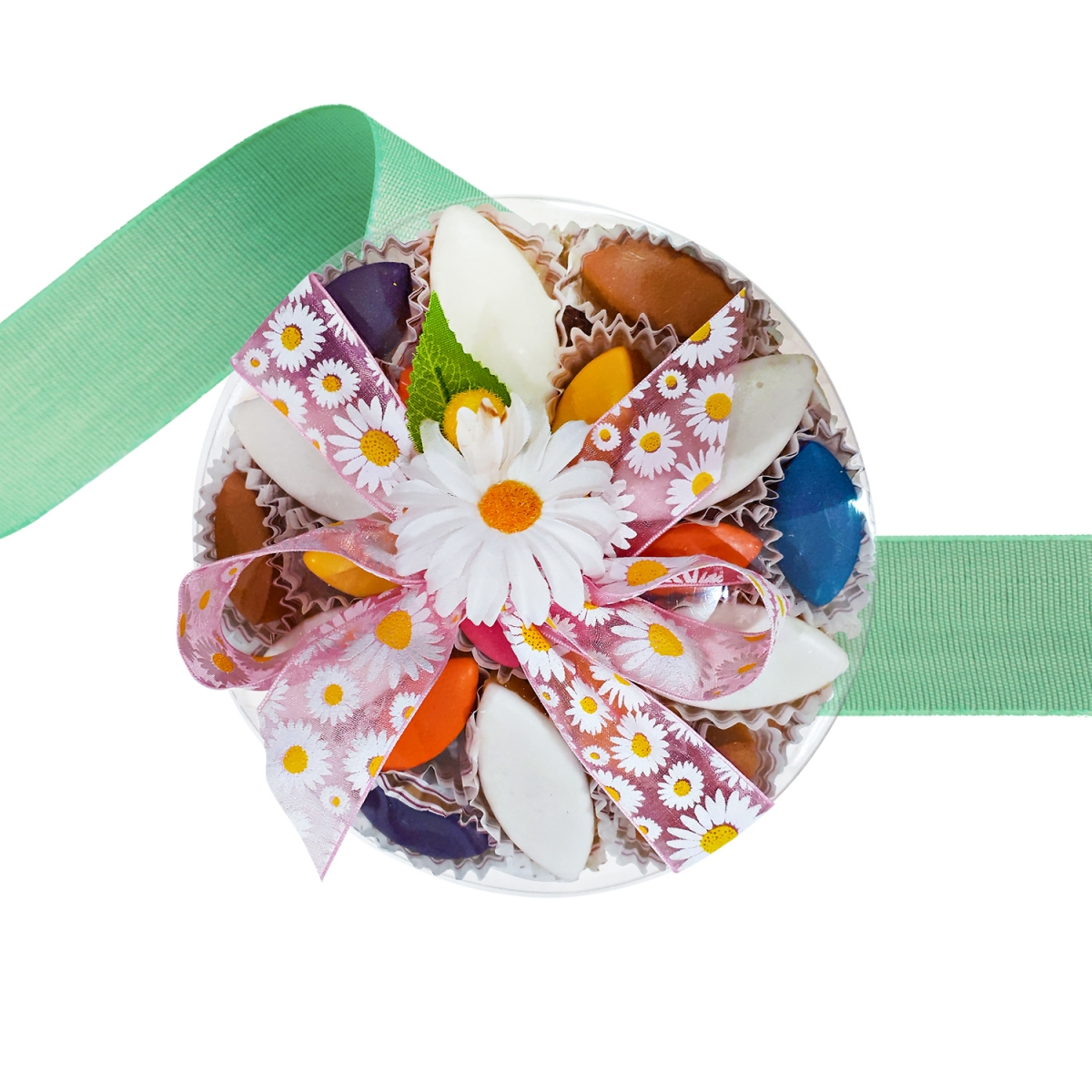 Un magnifique coffret gourmand de Printemps, tout en couleurs et en douceur, composé d’un mandala de calissons et calissous disposés sur deux étages.