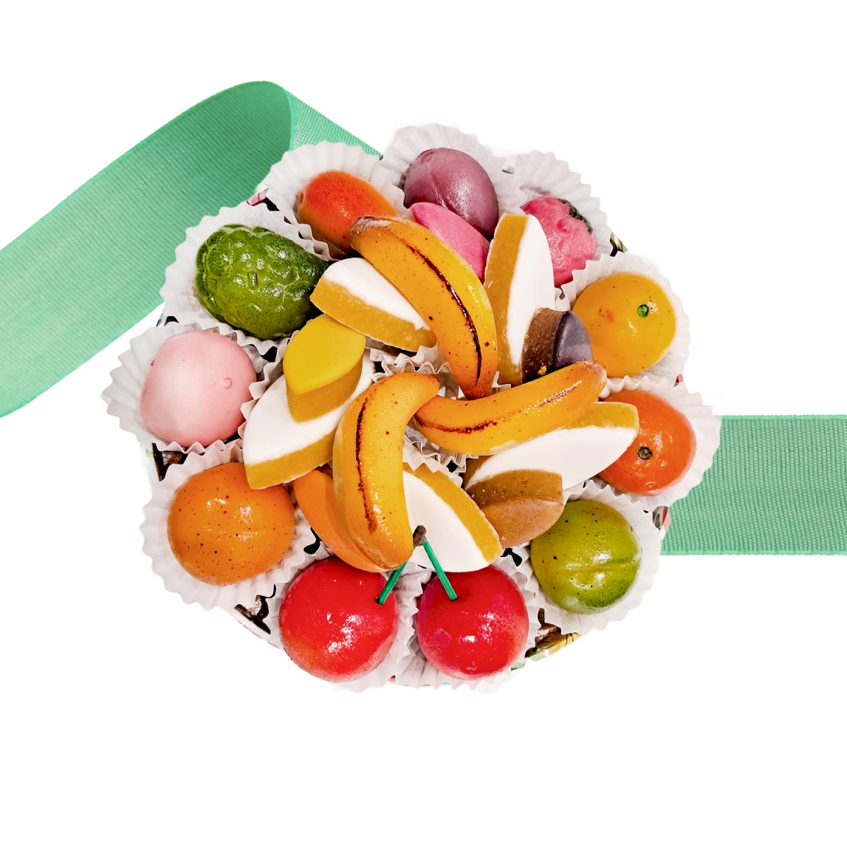 De délicates pâtes d’amande façonnées à la main en fruits colorés,