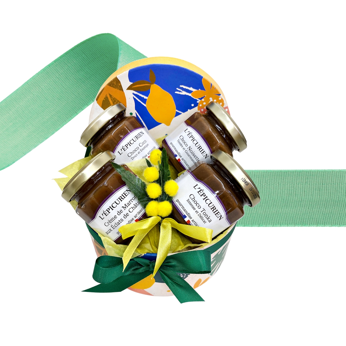 Ce bel écrin renferme trois pâtes à tartiner artisanales L’Épicurien, élaborées avec le chocolat Valrhona et garanties sans huile de palme :