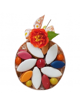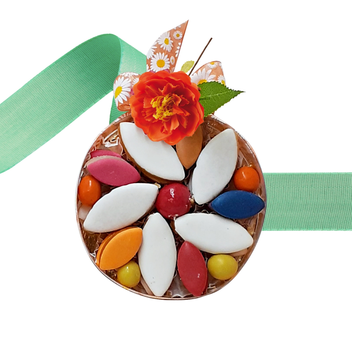 Petit coffret médaillon Pâquerette gourmande, garni sur 2 étages de Calissons moelleux Calissous aromatisés et billes de pâtes de fruits enrobées de chocolat assorties (Oranges et Cirons confits aux 2 chocolats.)
