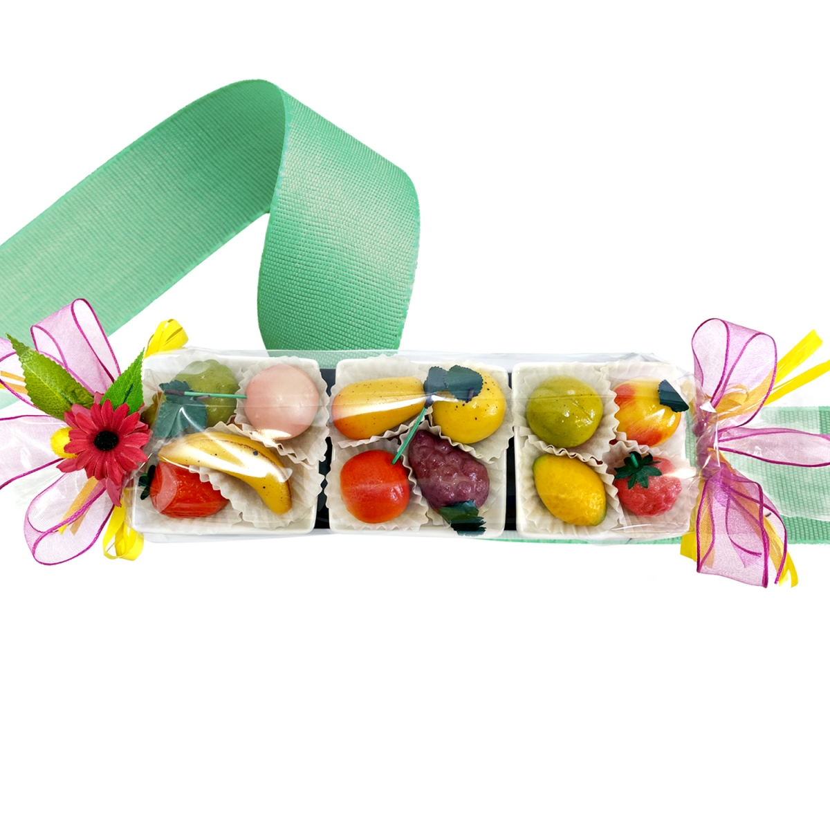 Un élégant ensemble de trois ramequins en céramique garni de 15 délicieuses pâtes d’amande artisanales, façonnées à la main en de jolis fruits colorés et brillants.