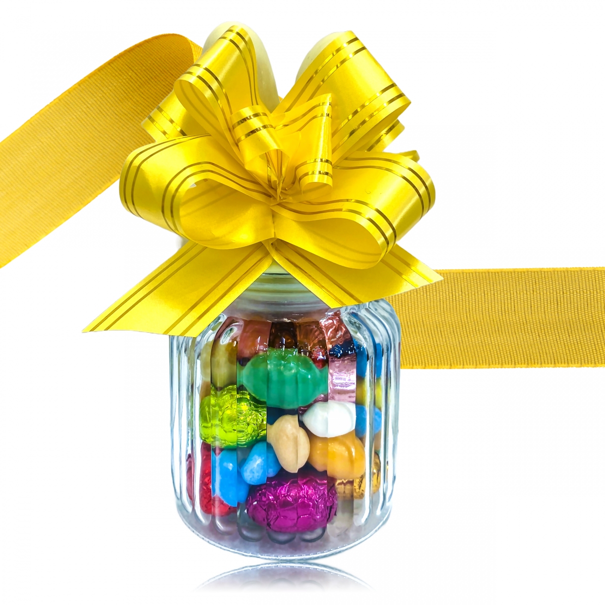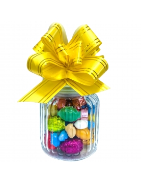 Bonbonnière en verre avec son couvert en oreilles de lapin jaune vanille garnie de 200g de délicieux petits œufs en chocolats en robe métallisée multicolores. (Œufs enveloppés chocolat assortis, œufs au sucre et œufs nougatine colorés)