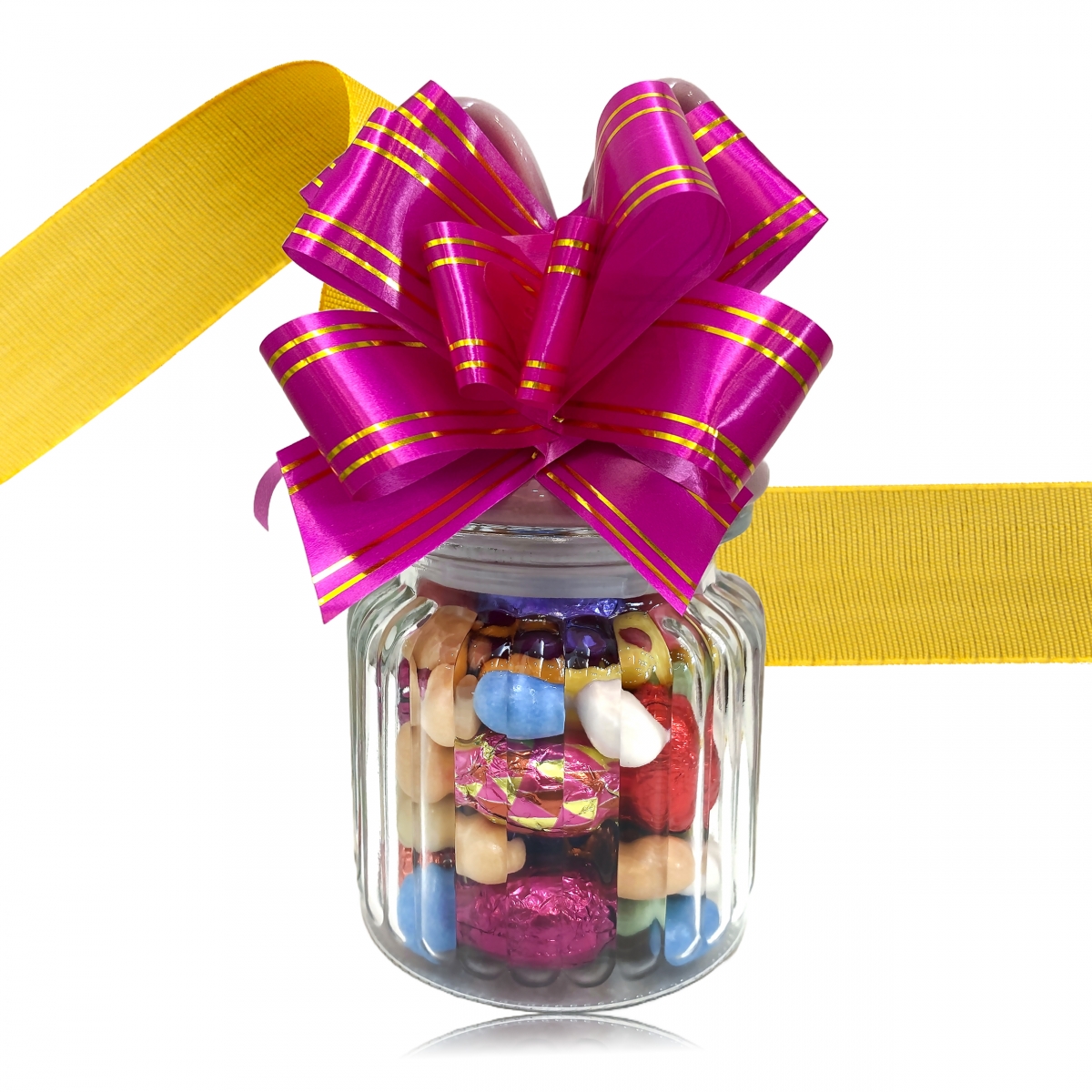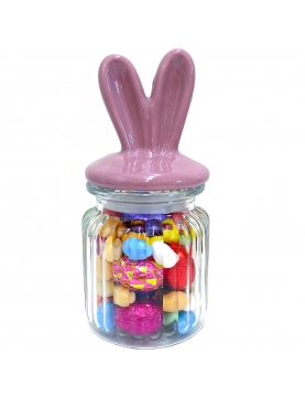 Bonbonnière en verre avec son couvert en oreilles de lapin lilas garnie de 200g de délicieux petits œufs en chocolats en robe métallisée multicolores. (Œufs enveloppés chocolat assortis, œufs au sucre et œufs nougatine colorés)