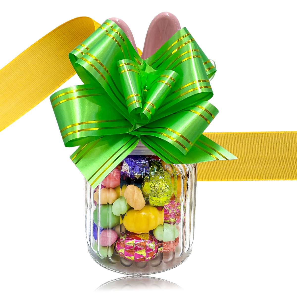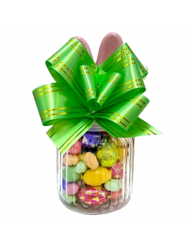 Bonbonnière en verre avec son couvert en oreilles de lapin rose garnie de 200g de délicieux petits œufs en chocolats en robe métallisée multicolores. (Œufs enveloppés chocolat assortis, œufs au sucre et œufs nougatine colorés)