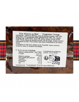 Ingrédients principaux : farine de seigle, miel (18 %), gingembre (13 %), écorce d’orange confite, sucre candi, épices.