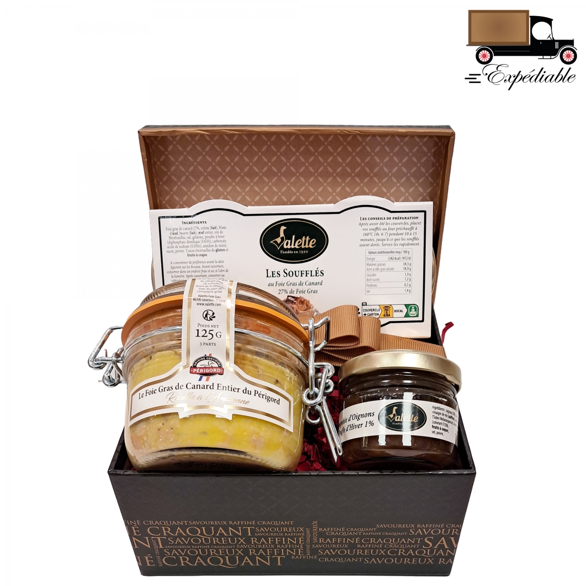 Une invitation à la gourmandise avec ce coffret d’exception, où le foie gras du Périgord rencontre des soufflés délicatement fondants et une compotée d’oignons à la truffe pour une touche subtile et raffinée.