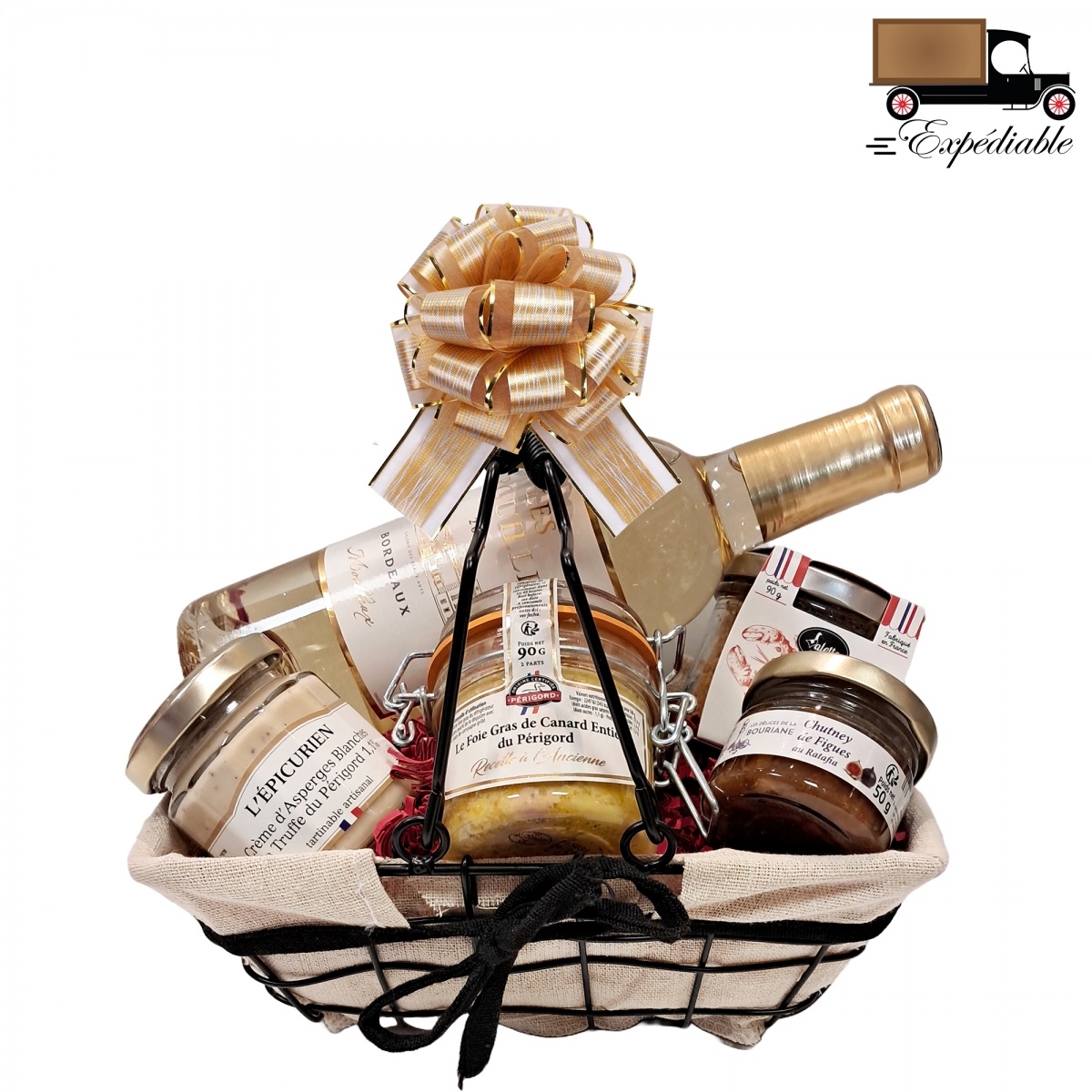 Offrez ou partagez un moment gourmand et convivial avec ce panier apéro plein de saveurs! Dans un joli panier en métal noir habillé, découvrez une sélection de délices, parfaits pour un apéritif raffiné.