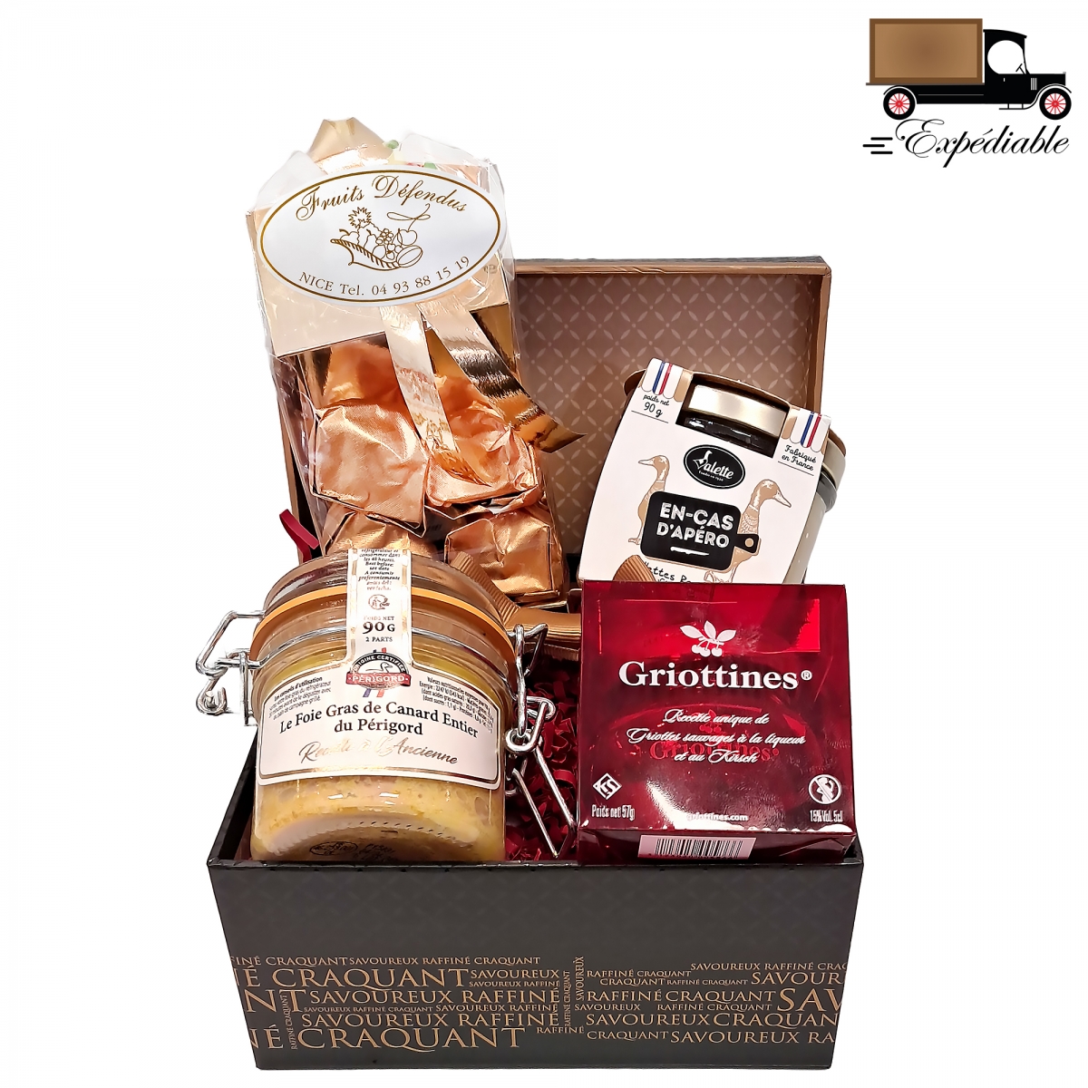 Ce coffret réunit des trésors de la gastronomie : foie gras du Périgord, rillettes royales, marrons glacés extras fondants et Griottines à la liqueur et au Kirsch. Un véritable voyage de saveurs à savourer ou à offrir, pour un moment de gourmandise absolue.