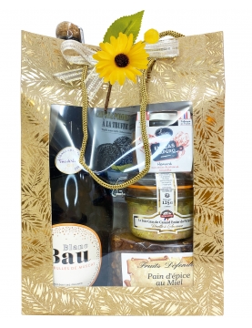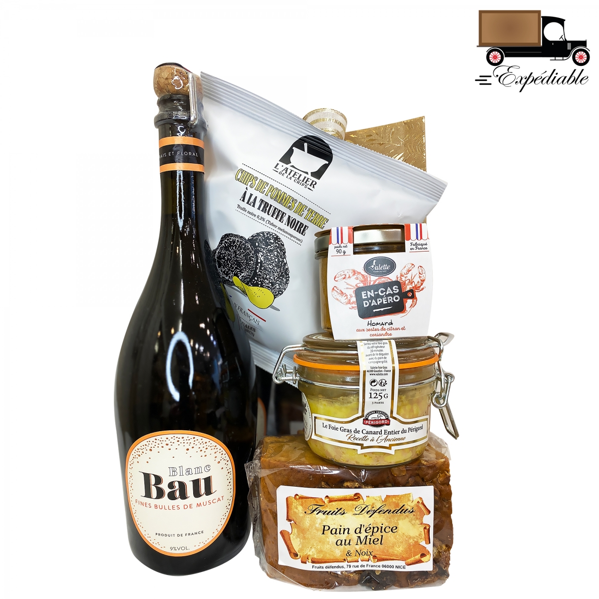 Un apéritif raffiné, où l’élégance rencontre la gourmandise! Ce sac réunit le pétillant Muscat, le foie gras de canard à l'ancienne, des chips à la truffe, et des en-cas savoureux au homard, pour un moment de dégustation chic et gourmand. Un régal à partager ou à savourer pour un apéro haut en saveurs. Un vrai festin pour les papilles!