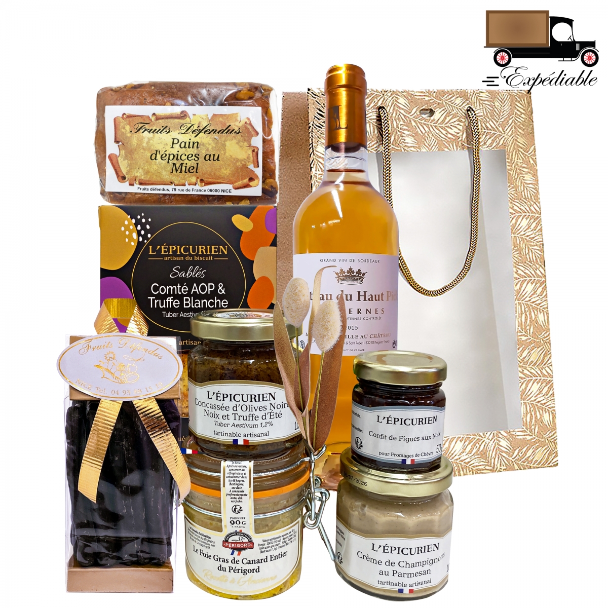 Un sac garni élégant où se mêlent l’excellence des saveurs : un Sauternes raffiné, un foie gras délicat, des douceurs au chocolat et des produits de terroir sublimes. Idéal pour un moment gourmand d’exception, à offrir ou à savourer lors de vos occasions festives. Un véritable voyage des sens, en toute élégance!