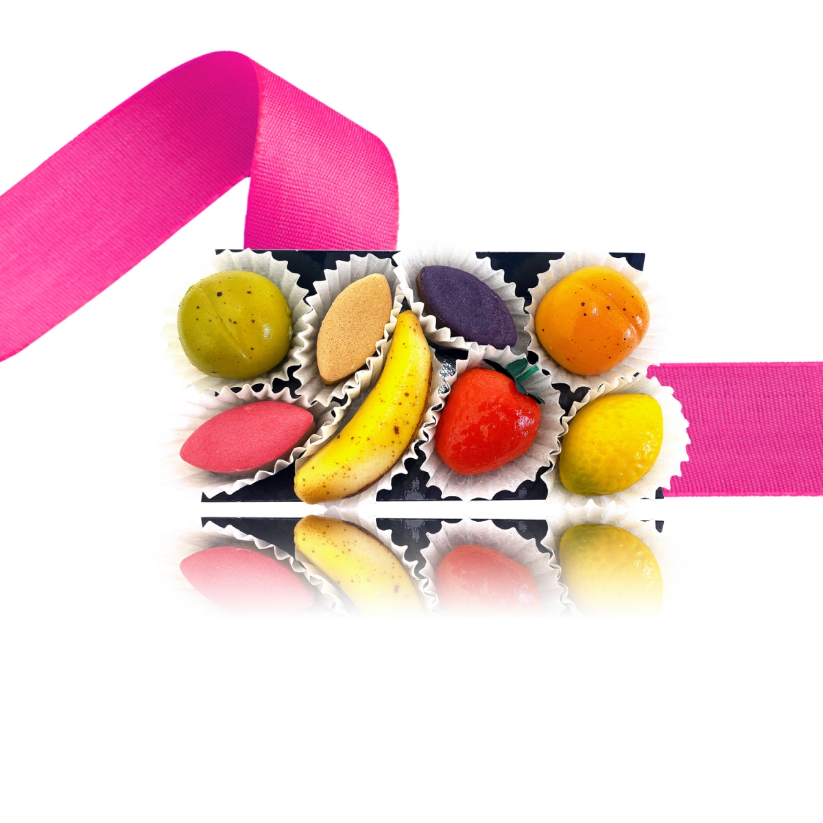 Laissez-vous tenter par notre Étui Découverte : 7 délicates bouchées de pâte d’amandes, finement sculptées et colorées comme de véritables petits fruits.