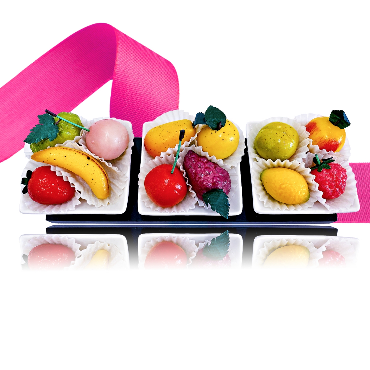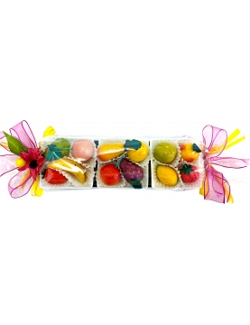 Un trio inséparable de ramequins en céramique, offrant 15 moelleuses et savoureuses pâtes d’amande déguisées en fruits.